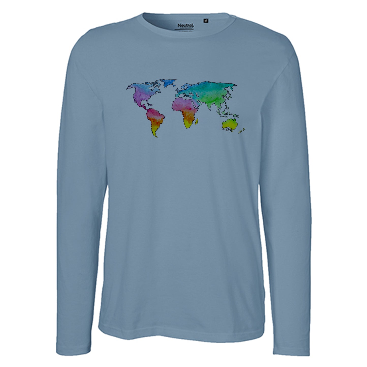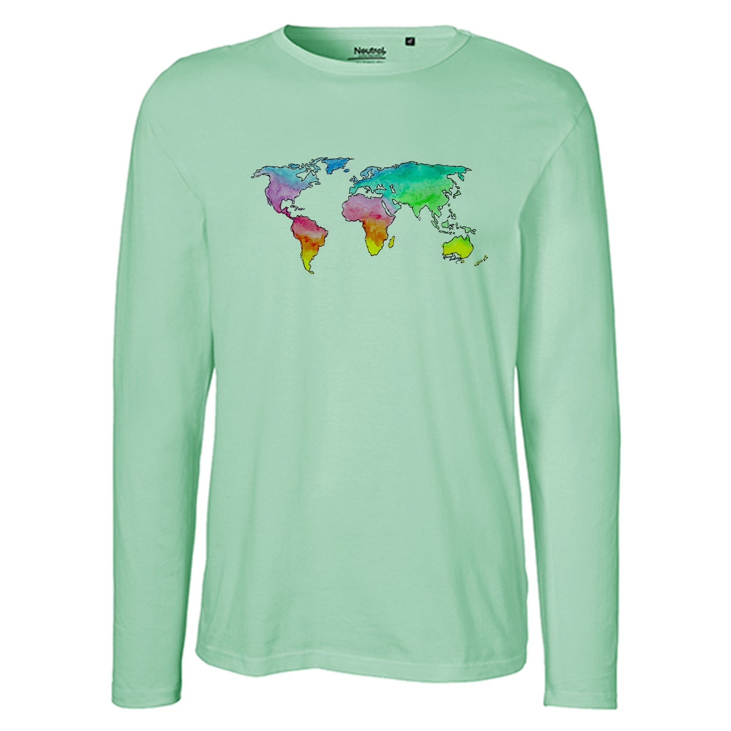 Herren FairTrade Longsleeve Shirt | Motiv"Weltkarte Regenbogen" | 100% Bio-Baumwolle und aus nachhaltiger Produktion | Größen S-3XL
